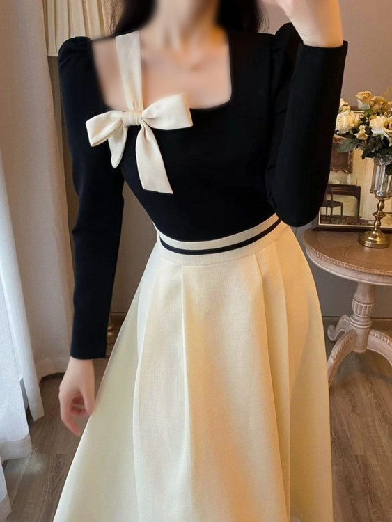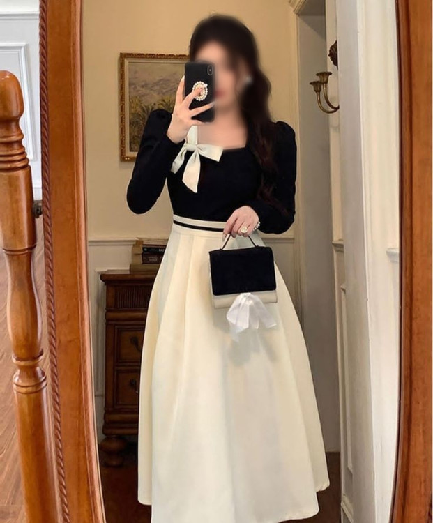 ✅️ترکیب مشکی کرم ( بالاتنه مشکی با پاپیون کرم،دامن لباس متصل هست و پشت لباس زیپ مخفی میخوره)
